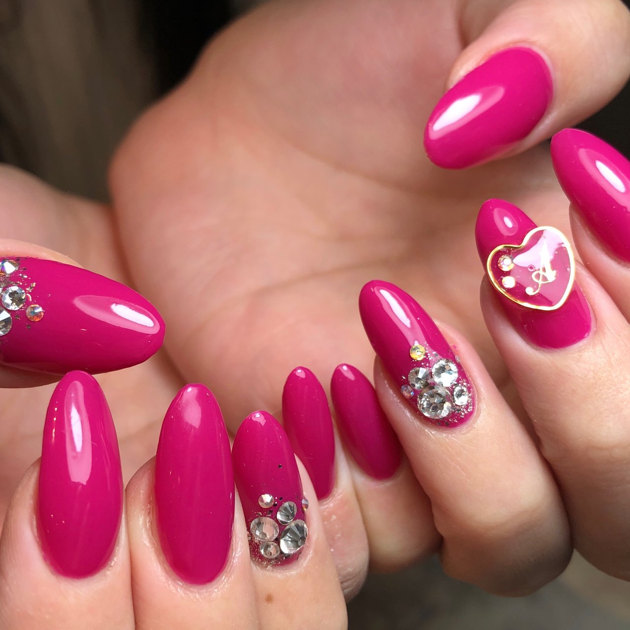 宝石チャームのショッキングピンクネイル ネイルサロンmoca モカ 大阪 兵庫 奈良 ネイル ショッキングピンク ネイルサロン